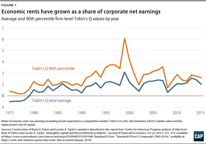 There is now strong evidence that barriers to entry have a significant effect on many sectors of the U.S. economy. Measures to evaluate firm-level economic performance indicate that many firms have market power and are earning profits above competitive levels. For a significant number of firms, the ratio of a firm’s market value to the replacement cost of its capital has risen to well above 1. This indicates that firms are able to extract economic rent, meaning that they are able to net incomes exceed competitive levels. (see text box on Tobin’s Q below) The share of large firms earning rents has risen since the late 1970s, along with the share of rents in total corporate profits. This could not happen without the existence of powerful entry barriers.