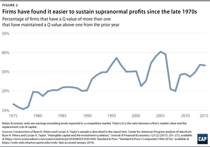 This interpretation of the data is supported by the fact that it has become easier for firms to earn rents in successive years. Figure 2 displays the share of firms in the Peters-Taylor sample with a Q greater than 1 in one year that maintained a Q greater than 1 in the next year. This number rises from around 10 percent of firms in 1980 to around 40 percent of firms in 2015, suggesting increased inertia around rent extraction. In other words, it has become more likely that a firm that earns measurable rent will be able to do so in a subsequent year. This is consistent with the expected effects of a decline in competition.