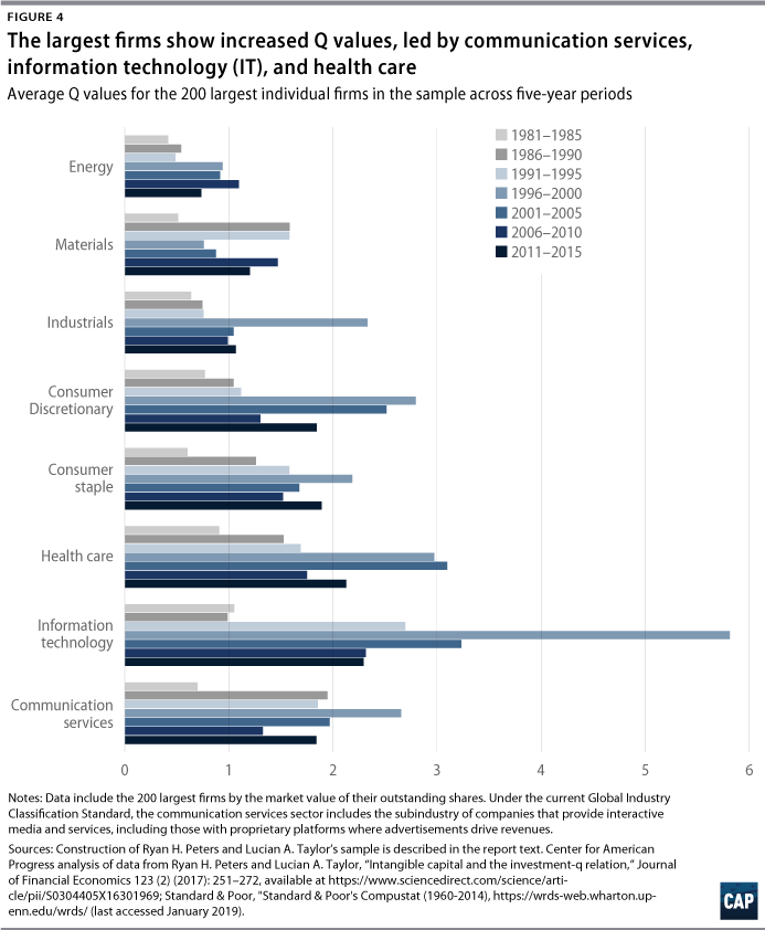 There is also evidence of differing degrees of market power across sectors of the economy. Figure 4 displays the average Q values for the 200 largest U.S. corporations by market capitalization in the Peters-Taylor sample, sorted into several broad Global Industry Classification Standard sectors.12 While there was a general upward trend in Q values across most sectors during the years 1981–1985 and 2011–2015, not all sectors ended the period with values significantly larger than 1.
