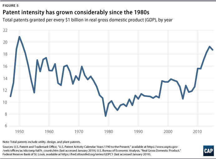 Intellectual property protection, a source of state-sanctioned monopoly power, is playing an increasingly important role in the U.S. economy. Because of changes to the patent system, since the 1980s, patents have become easier to obtain and enforce, and the rewards for enforcement claims have increased.46 Beginning around 1980, there has been a significant increase in patent awards, both in absolute numbers and relative to total output. (see Figure 5) In addition, as economist Dean Baker has emphasized, the Bayh-Dole Act of 1980 made it possible for private actors to obtain patent rights for publicly funded inventions such as medicines that are based on science funded by the National Institute of Health.47