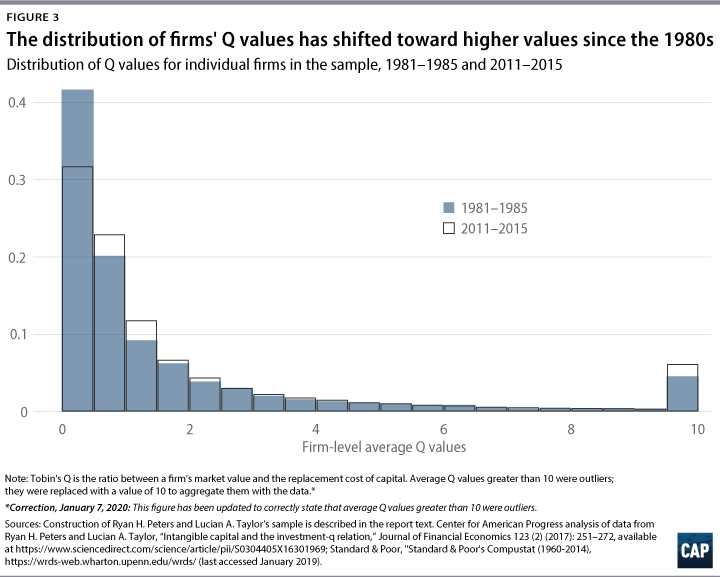 There is, of course, heterogeneity in the relative market power of firms. While the mean value of Q has trended upward, Q values for many firms reflect competitive returns. Figure 3 shows the distribution of Q values for individual firms in the Peters-Taylor sample averaged across 1981–1985 and 2011–2015. Both mean and median values have shifted right, and the right-hand tail of the distribution is more heavily populated, but many firms have Q values at or below 1.11