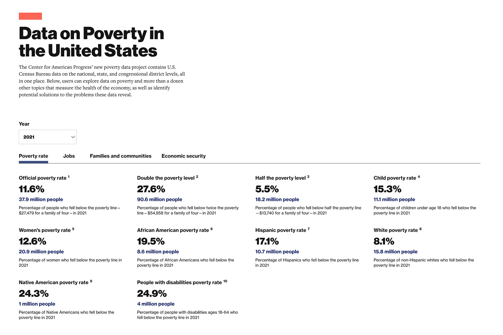 Data on Poverty in the United States DashboardSeptember 19, 2022 Data on Poverty in the United States The Center for American Progress’ new poverty data project contains U.S. Census Bureau data on the national, state, and congressional district levels, all in one place. Below, users can explore data on poverty and more than a dozen other topics that measure the health of the economy, as well as identify potential solutions to the problems these data reveal. Sep 19, 2022